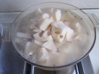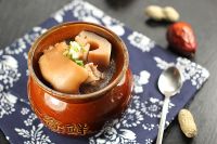 莲藕是湖北人冬季煨汤最喜欢的食材之一,白嫩嫩的藕煮熟后变成了粉色,性质也由“凉”变“温”,可滋阴、养血。藕很容易入味,浓郁的汤汁浸入藕中,炖煮后莲藕非常粉糯,口感绵软;而含有丰富的胶原蛋白的猪手,味道非常香浓,内外滋养。 其实猪蹄的脂肪含量也比肥肉低,并且不含胆固醇, 所以不要太惧怕它;如果不喜油腻的话可以把上面的一层油撇掉,拿喝起来就就一点负担也没有了, 所以这么润肤美颜汤也赶紧来上一碗吧。