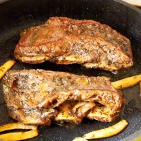 打开烤箱预热至180度;与此同时,取出腌好的牛排,在平底锅里两面略煎下以锁住内部的水份不流失