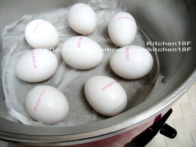 拿出电锅,底部铺上「已弄湿但不滴水」的厨房纸巾2张,摆上鸡蛋,盖上锅盖,按下开关即可。开关跳起时,先不掀盖,续焖3分钟。(蛋约8分熟)