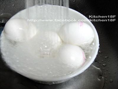 (此步骤可省略)将煮好的鸡蛋,置于水龙头下,冲冷水让它凉。(想吃8分熟水煮蛋,这时可顺便剥一颗来吃)