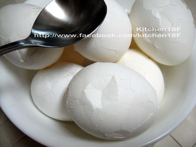 用汤匙轻敲蛋壳,让它有裂痕但不脱落,滷汁较易入味。(力气可以小一点,我太大力了,壳都凹了~糗)