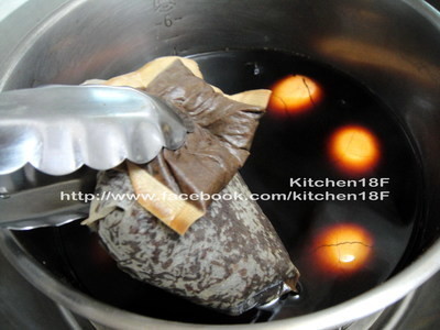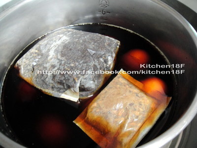 s开关跳起时,马上取出「茶叶袋 和 滷包」,蛋则继续泡在滷汁中1个小时入味。