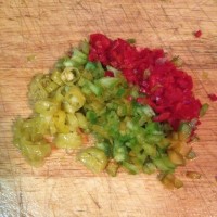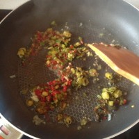 放入青红椒,泡椒,碎米杂菜翻炒。没有碎米芽菜可不用,或者用点榨菜末。
