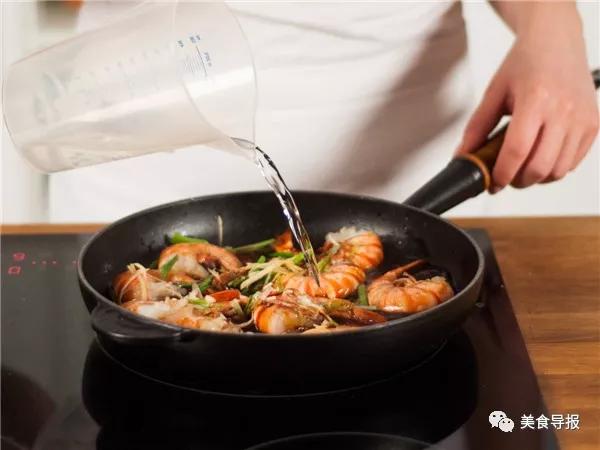 将植物油加入煎锅,用中火加热。放入大虾,将虾两面煎至变红,约1~2分钟;