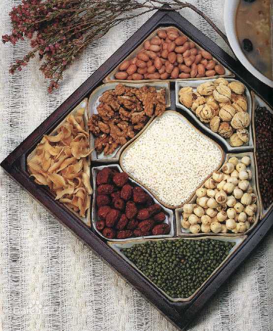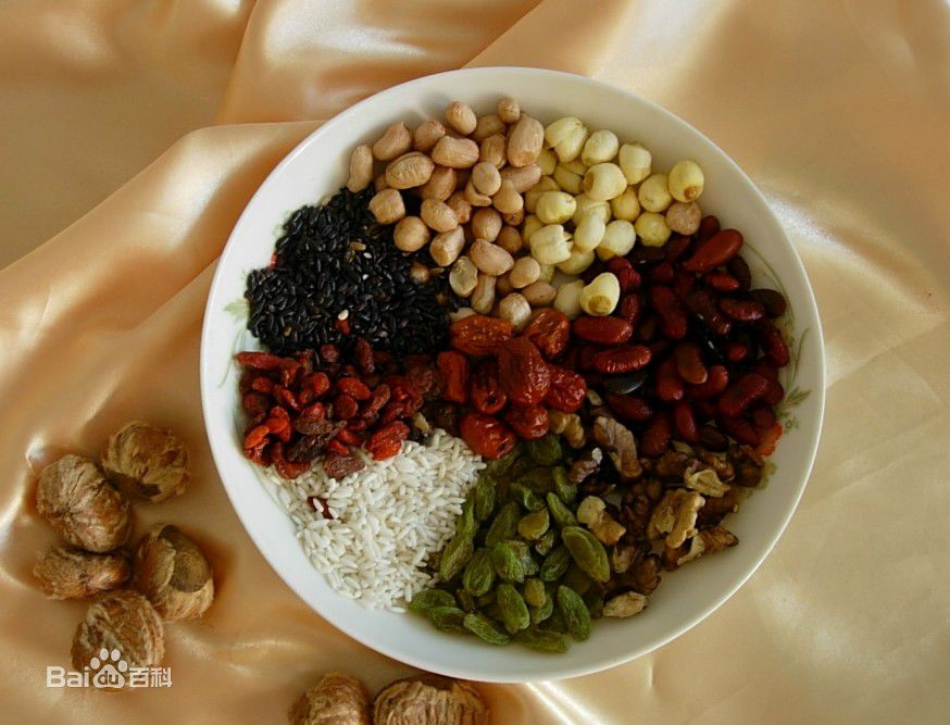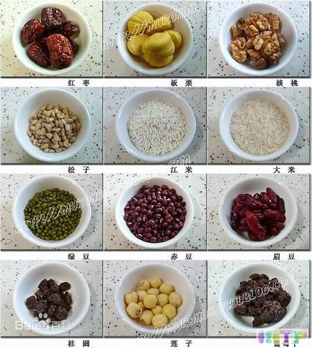 【原料】 大米50克,黄小米50克,粘黄米50克,糯米50克,秫米(粘高粱米)50克,红小豆100克,莲子100克,桂圆100克,花生米100克,栗子100克,小红枣100克,白糖适量。