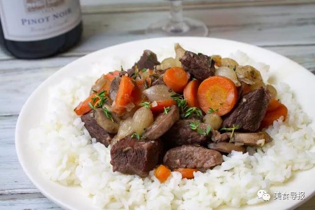 在长柄锅中,将培根煎至焦脆,置于铺有厨用纸巾的盘中晾干;将牛肉煎至表面呈棕色,同培根、土豆和红葱头一起转入炖锅。煎胡萝卜,洋葱和大蒜一起加入炖锅;