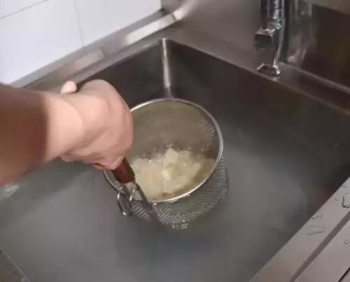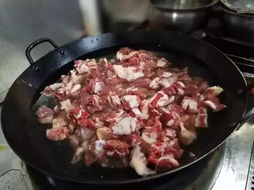 2、新鲜羊排切成小块,冷水下锅,待水烧沸、打掉浮沫后捞出。