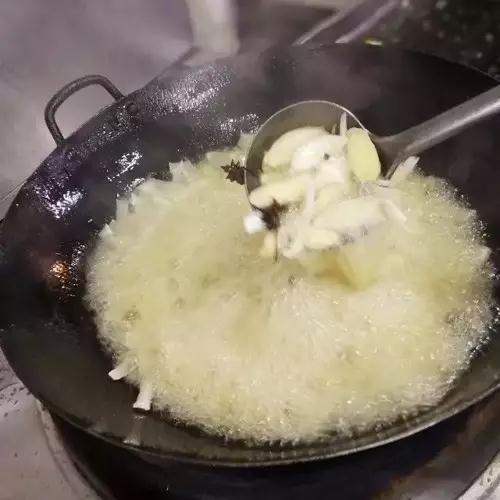 3、锅入色拉油烧热,下葱姜蒜、八角、花椒、白胡椒各适量炸香,再下入干辣椒、自制辣酱炸香,将所有料一起捞入纱布扎紧,锅内红油留用。