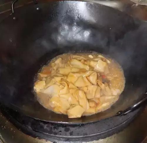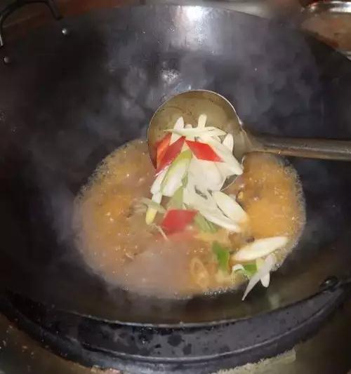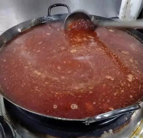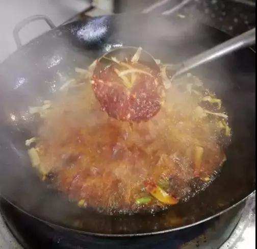 4、将汆好的羊排倒入煸至吐油、变色,添清水后放入步骤3制好的料包,大火烧开,转中火煮半小时,关火后先撇出上层的红油,再舀出红汤,最后盛出羊排,三者分别装入不锈钢盛器中保存。