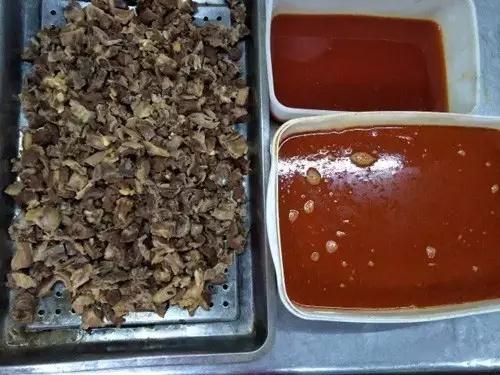 1、自制辣酱:肉辣皮子(新疆特产,又叫铁皮椒,肉质肥厚、油润微甜,香气浓郁,色泽红亮,辣度很轻)用清水泡透后捞出沥干,入搅拌机绞成中粗辣椒碎,锅放底油,放入辣椒碎小火煸香成酱,晾凉备用。