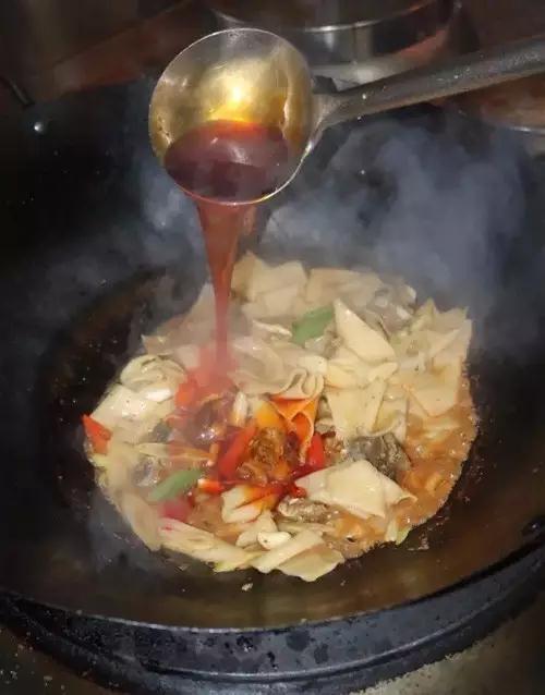净锅上火,放入熟羊排,舀入一勺原汤没过原料,烧开后撒入马耳葱段、青红椒块,下入煮熟的皮带面,调入少许老抽、孜然粉一起烩约2分钟,待汤汁几乎收尽时,淋入半勺预制时撇出的红油,翻炒均匀即可出锅。