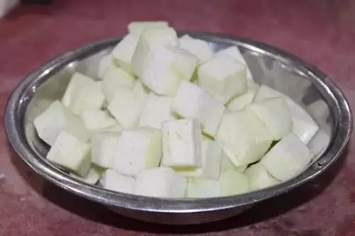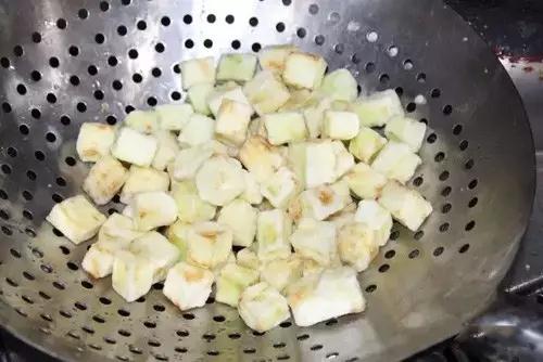 1、茄子去皮,改刀成1.5厘米见方的丁。