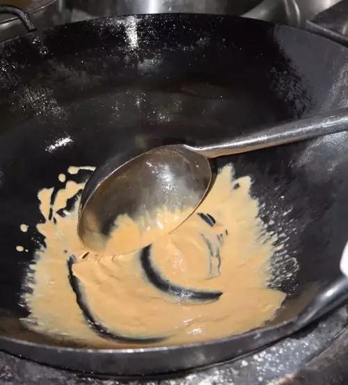 在熬糖麻汁时,有的师傅是先熬糖再加水、放麻汁,而我是先熬麻汁再添水、加糖。我认为前者有两个弊端: