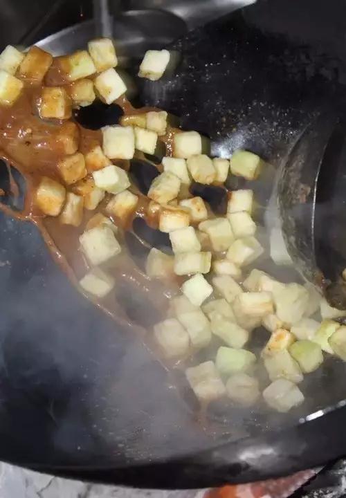 5、添入清水,下白糖小火熬成粘稠状浓汁,下入炸至上色的茄子丁,快速翻勺裹匀糖麻汁、撒上熟芝麻即可出锅。