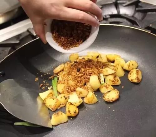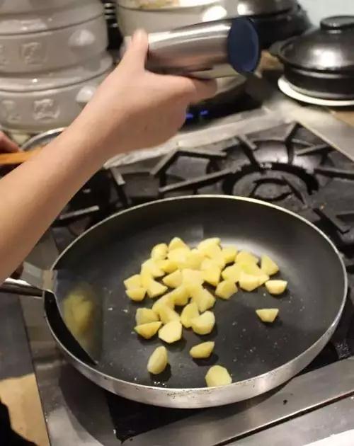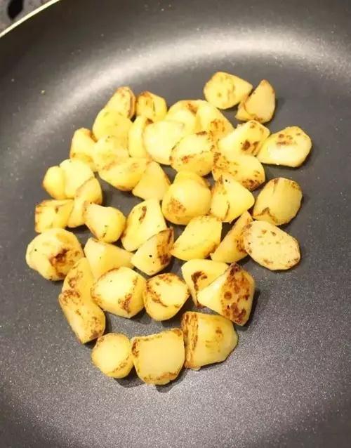 1、蒸熟的恩施土豆块放入平底锅中煎制,撒盐、黑胡椒碎等调料。