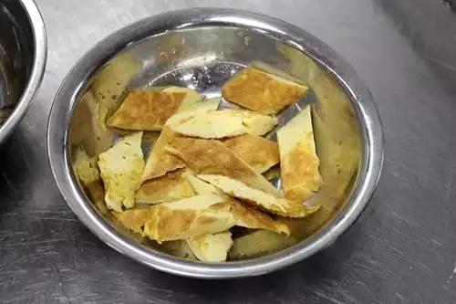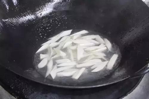 2、茭白块入油盐水焯至断生后捞出控水。