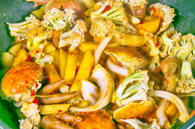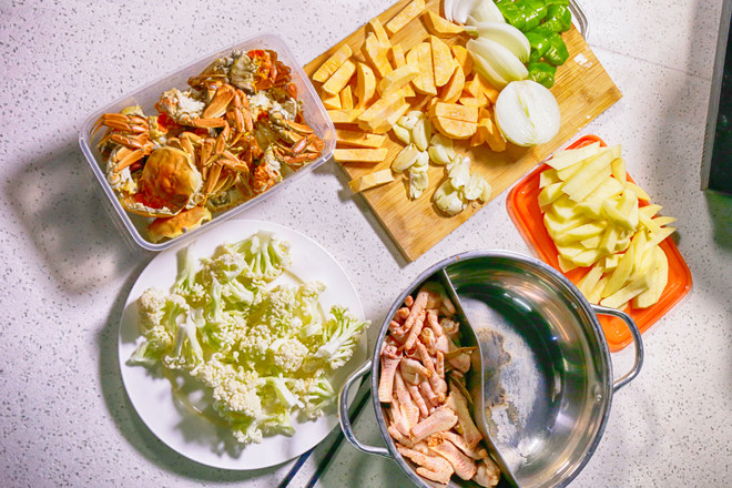 备好食材,大闸蟹提前蒸熟(隔水蒸20分钟),蔬菜切块,鸡爪用酱油料酒腌制十分钟