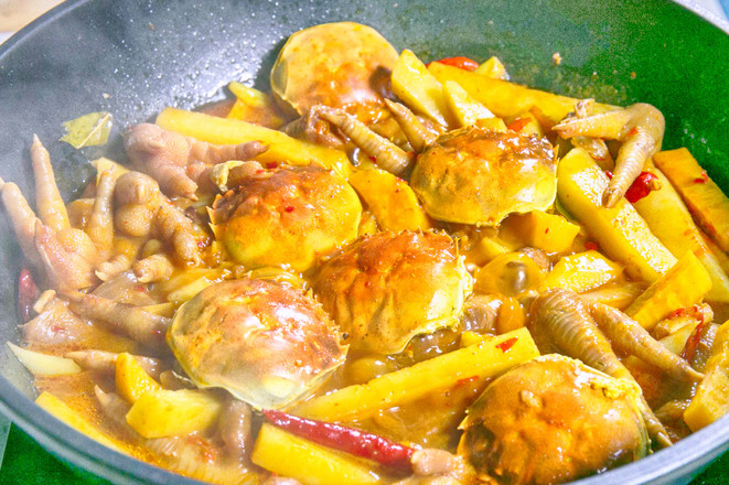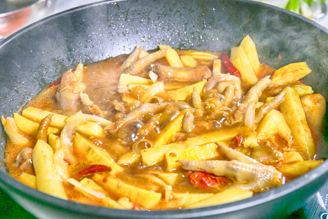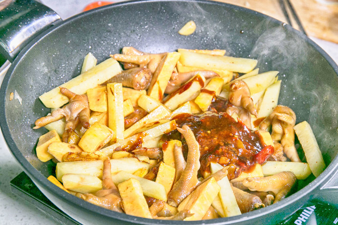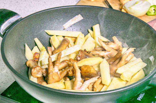 热锅倒油,稍微比炒菜的时候多一点油即可,下入大料香叶五香粉鸡爪炒香,加入土豆与地瓜,翻炒上色
