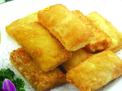 2. 金瓜泥、鳕鱼丁、菊花末与橙汁、蜂蜜、炼乳、盐5克、猪油拌成瓜蓉,将瓜蓉包在威化纸成条状,挂上脆皮糊,裹匀面包糠。