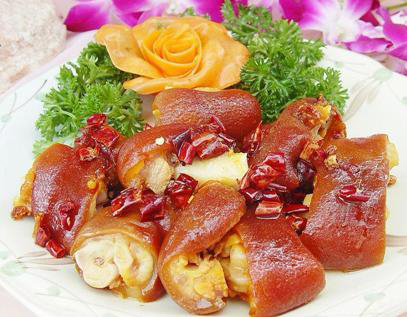 此时需要加入生姜片,葱段,八角,花椒,绍酒,少量的味精与盐,目的仍然是去除猪手的寒气与腥臭。