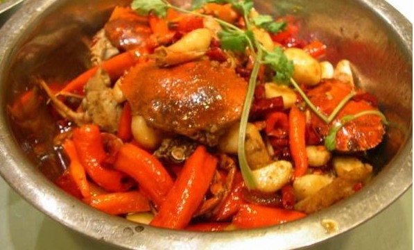 5. 放入蟹煸炒一会儿,再加入尖椒片继续翻炒。