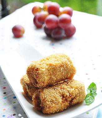 7. 锅置中火上放熟猪油,烧至四成热,下鸡丝卷炸至内熟外黄时捞起;