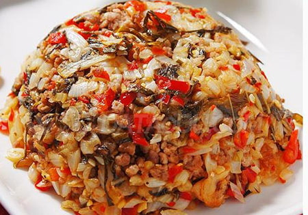 最后把刚才炒到干爽的糟白菜倒入锅中,与碎肉一起翻炒均匀,出锅前加白糖再翻炒上味即可(会颠锅的尽量表现颠锅的技艺,这道菜一定要把糟白菜和碎肉炒匀)。