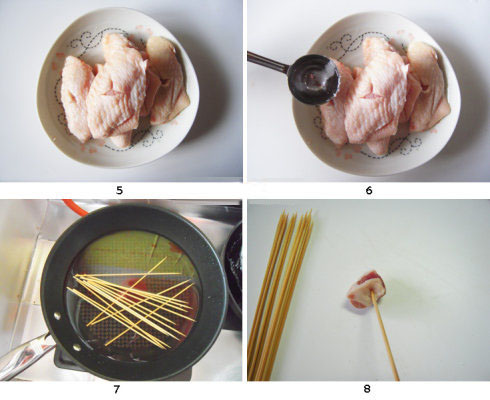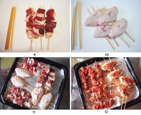 10.在每两根竹签子上分别穿上两个鸡翅中。