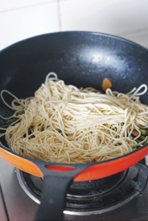 加盖中小火慢慢焖,直到锅中水分快要收干,最后用筷子将面条和豆角拌匀即可。