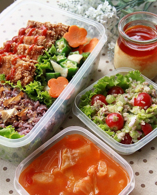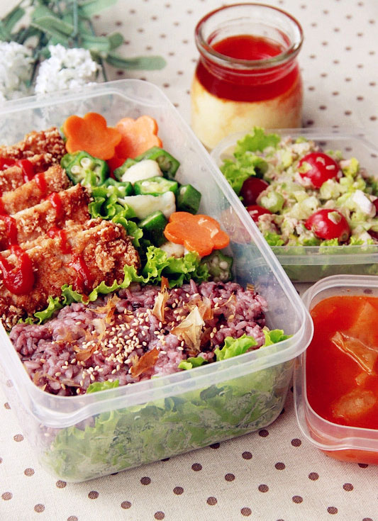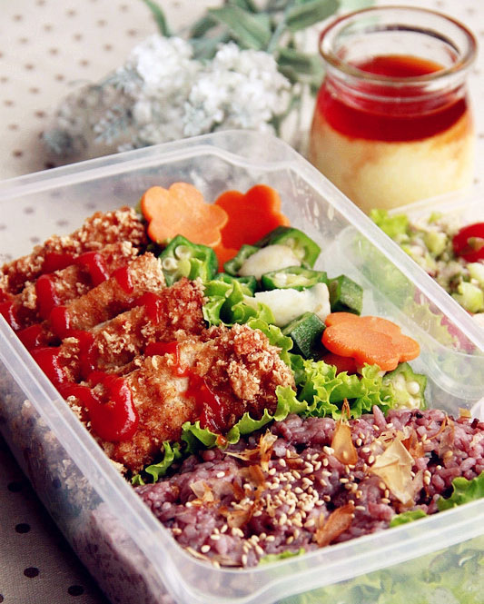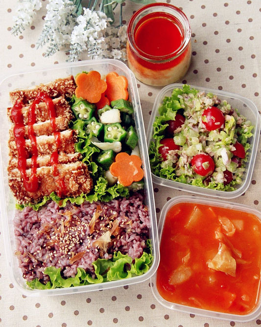 将所有的食物都移到便当盒里去吧,在黑米米饭的表面撒点芝麻和柴鱼片会更好吃,炸猪排上可以淋上点番茄酱调味,沙拉和汤需要单独放,别忘了还有午后甜点牛奶炖蛋,好了,一份上班族的豪华便当就准备齐了