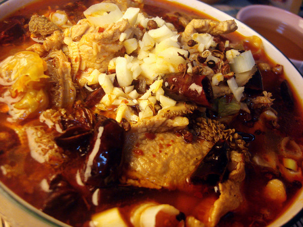然后放入豆豉酱和辣椒油一起炒;炒完放入水等水开,放八角和花椒;再把肉和牛肚放进去;干豆腐丝和生菜熟的快,熟烂了也不好吃;在最后五分钟放即可;等过五分钟捞锅,又麻又辣的水煮肉片完成~~