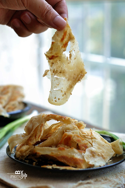 中间再翻一次面,用铲子给饼扎洞,这样油会渗入到饼中,增加酥脆口感