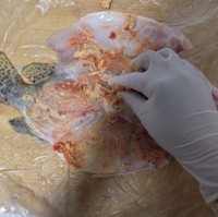 将鱼从案板上移至稍大的盘中,用干净的筷子拣出5~6块臭豆腐放在鱼身上。右手戴一次性手套,将臭豆腐均匀抹满桂鱼的全身(里、外两面,花刀里面全部都要抹到)