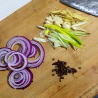 姜切丝、蒜切片、葱切段、干红辣椒切段、花椒几粒备用
