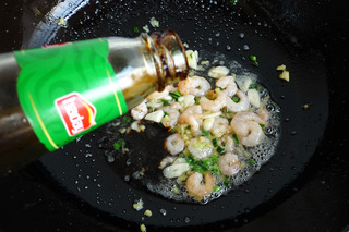 3、另起油锅,七成热,爆香葱姜蒜碎,倒入腌制好的大虾仁,快速翻炒至变色,加蚝油调味。
