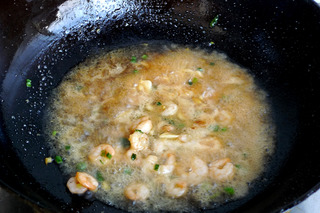 9、将事先烧好的虾仁汤汁倒入。