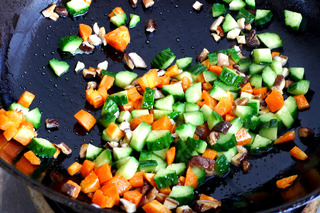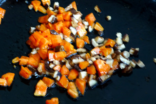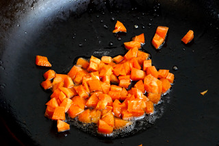 5、再起油锅,七成热,放入胡萝卜丁,翻炒均匀。