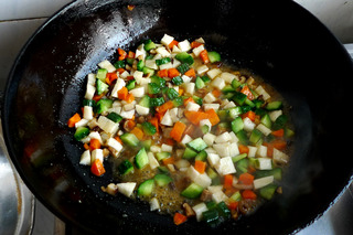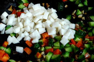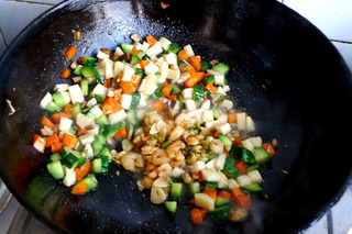 7、放入黄瓜丁,炒均匀。