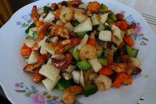 大虾仁 (20多个) 大腰果 (10余个) 黄瓜 (1根) 山药 (半根) 胡萝卜 (半根) 香菇 (5、6个)