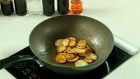 3、锅中放入油,加入杏鲍菇,煎至微黄,再淋入适量鲍鱼汁、生抽翻拌均匀.