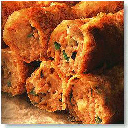 用一种唐山称为咯喳的东西,绿豆制品,薄薄的一张皮,裹住肉馅类内涵,用淀粉封口,然后入锅炸,由于皮特别,炸制成品味道也不错,酥酥的,脆脆的,又有淡淡的豆味,我小时侯很喜欢吃,现在由于咯喳没有那么好了,所以味道也不如以前了。