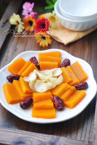 南瓜300g、鲜百合100g、红枣几个、冰糖15g。