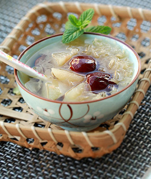 原料:红枣数颗、银耳100克、雪梨1个、冰糖50克。