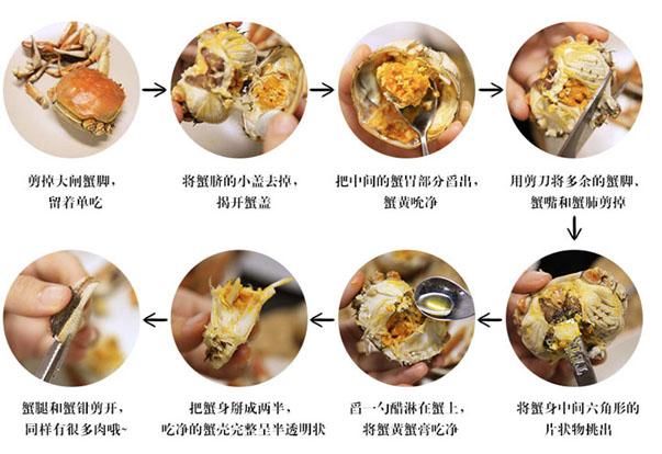 第三步 再捏住蟹壳,扳住螃蟹的双钳将蟹肚翻开,由肚脐处挤压肚脐盖中央的黑线,将其粪便挤出。最后用清水冲洗干净即可